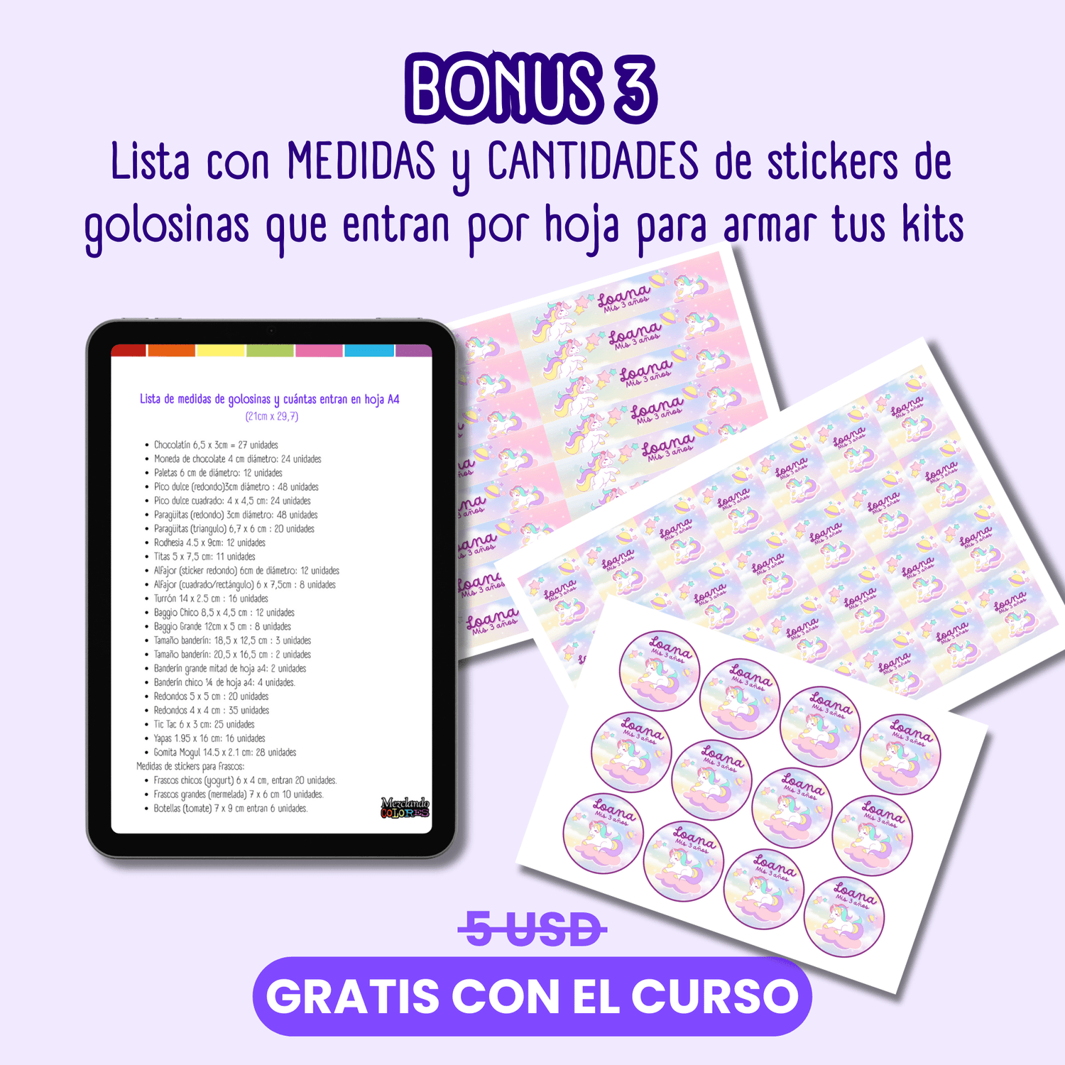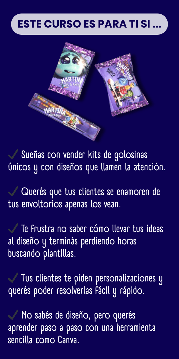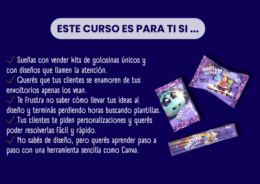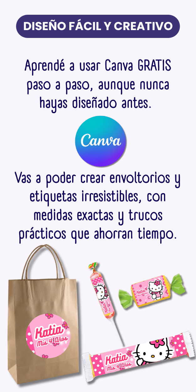 Vas a ver cómo adaptar los diseños según la golosina y cómo preparar los archivos para imprimirlos correctamente.